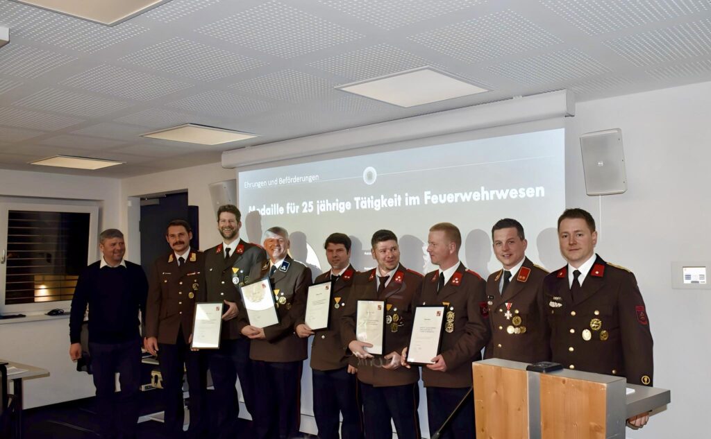 Im Rahmen der Jahreshauptversammlung wurden außerdem sechs Mitglieder mit der Medaille für 25 Jahre vorbildhafte Tätigkeit im Feuerwehrwesen ausgezeichnet: